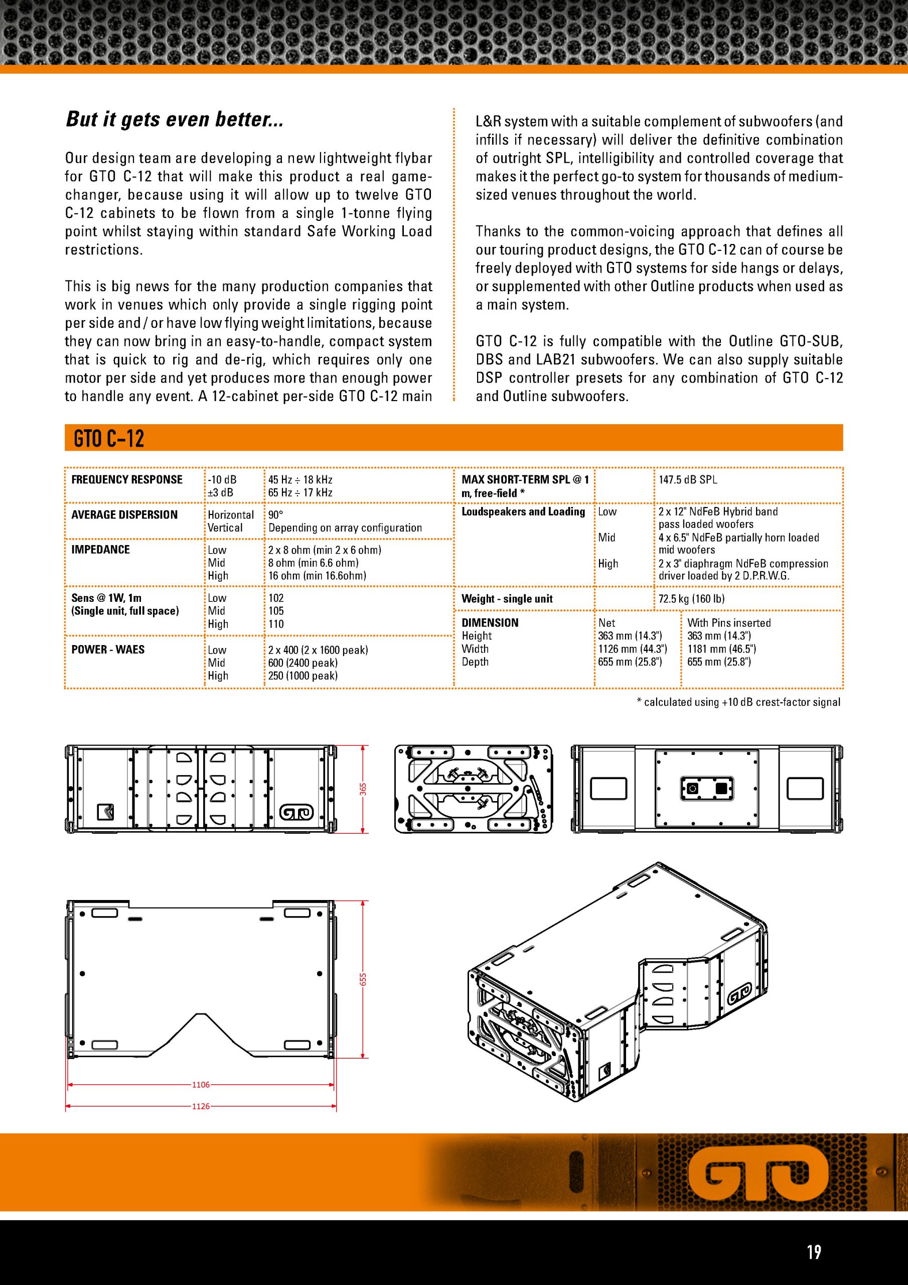 - Tương thích hệ thống mạnh mẽ: GTO C-12 có cùng chiều ngang với các module GTO khác (GTO, GTO-DF, GTO-SUB, GTO-LOW), đảm bảo tương thích hoàn toàn về phần cứng treo và vận chuyển. Ngoài ra còn tích hợp tốt với các subwoofer DBS, LAB21 và bộ xử lý tín hiệu DSP của Outline.